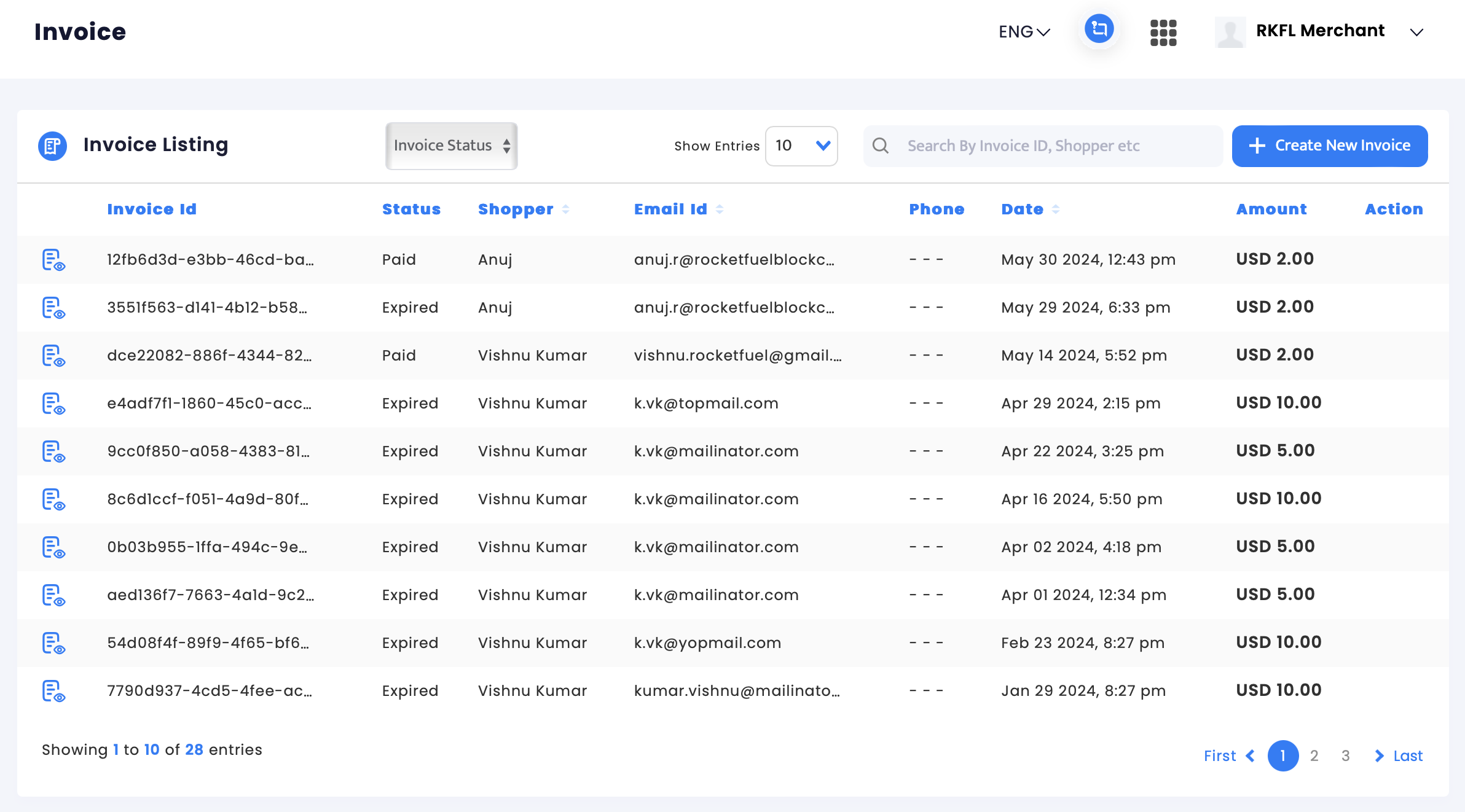 In the Invoices menu, you will be able to create invoices that can be shared with shoppers to make payments. Once an invoice is generated, you can share the Payment link with Shopper. You will also be able to see invoices you have created in the past. You can also search for the invoice via the search bar. The details you will see for the past invoices are:\