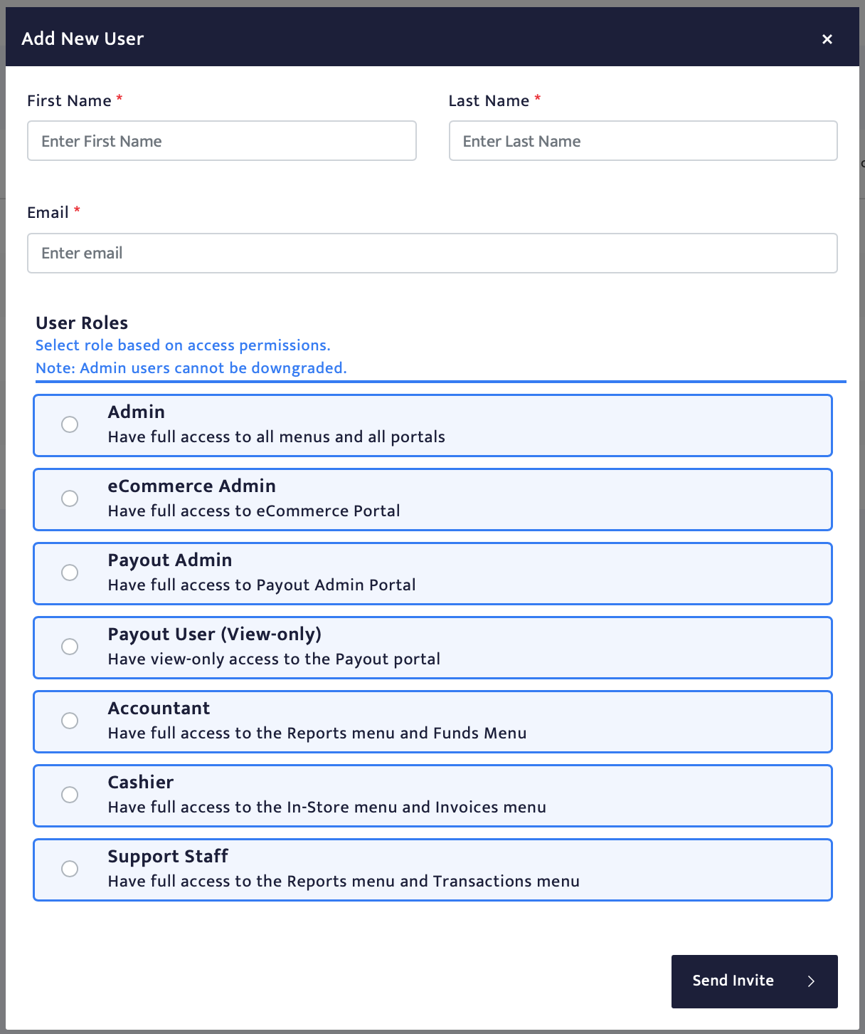 This menu lets you add users who can sign in to the RocketFuel merchant portal and access specific menu items as per their user roles.